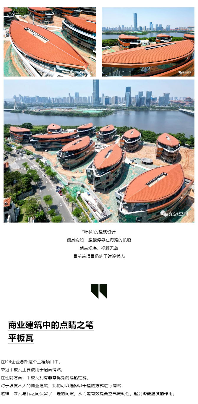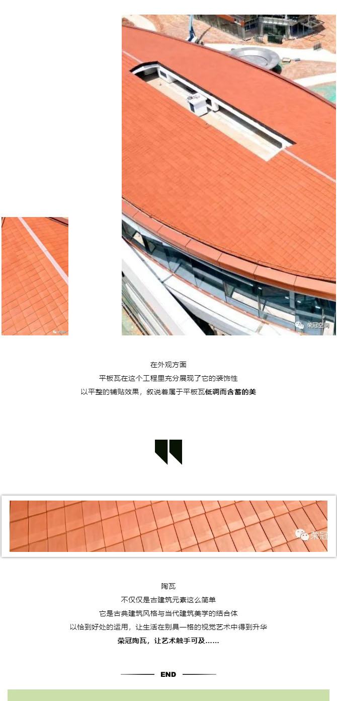 榮冠平板瓦,作為最具實用性的屋面瓦,其平整的瓦面,不僅能最大程度地展現屋面整齊劃一的美感,還能減少雜物在屋面上的堆積,這也是平板瓦深受客戶喜歡的原因之一